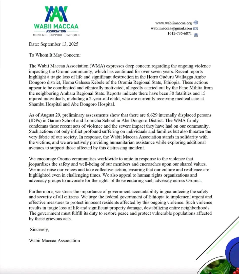Waldaan Wabii Maccaa jeequmsa hawaasa Oromoo irratti dhiibbaa geessisaa jiru, kan waggoota torbaa oliif itti fufee jiru ilaalchisee yaaddoo guddaa akka qabu ibsa. Gabaasni tibbana ba’e akka mul’isutti lubbuu namaa gaddisiisaa fi gaaga’ama guddaa Aanaa Horroo Guduruu Wallaggaa Ambe Dongoro, Homa Galessa Kebele Bulchiinsa Mootummaa Naannoo Oromiyaa, Ethiopia. Gochoonni kunneen qindoominaa fi sabaan kan kakaasan fakkaatu, Milishaa Faanoo Mootummaa Naannoo Amaaraa ollaa irraa kan raawwate jedhame. Gabaasni akka agarsiisutti daa’ima waggaa 2 dabalatee namoonni 30 du’aniiru, namoonni 15 ammoo madaa’aniiru, yeroo ammaa Hospitaala Shaambuu fi Hospitaala Abe Dongoro keessatti kunuunsa fayyaa argachaa jiru.