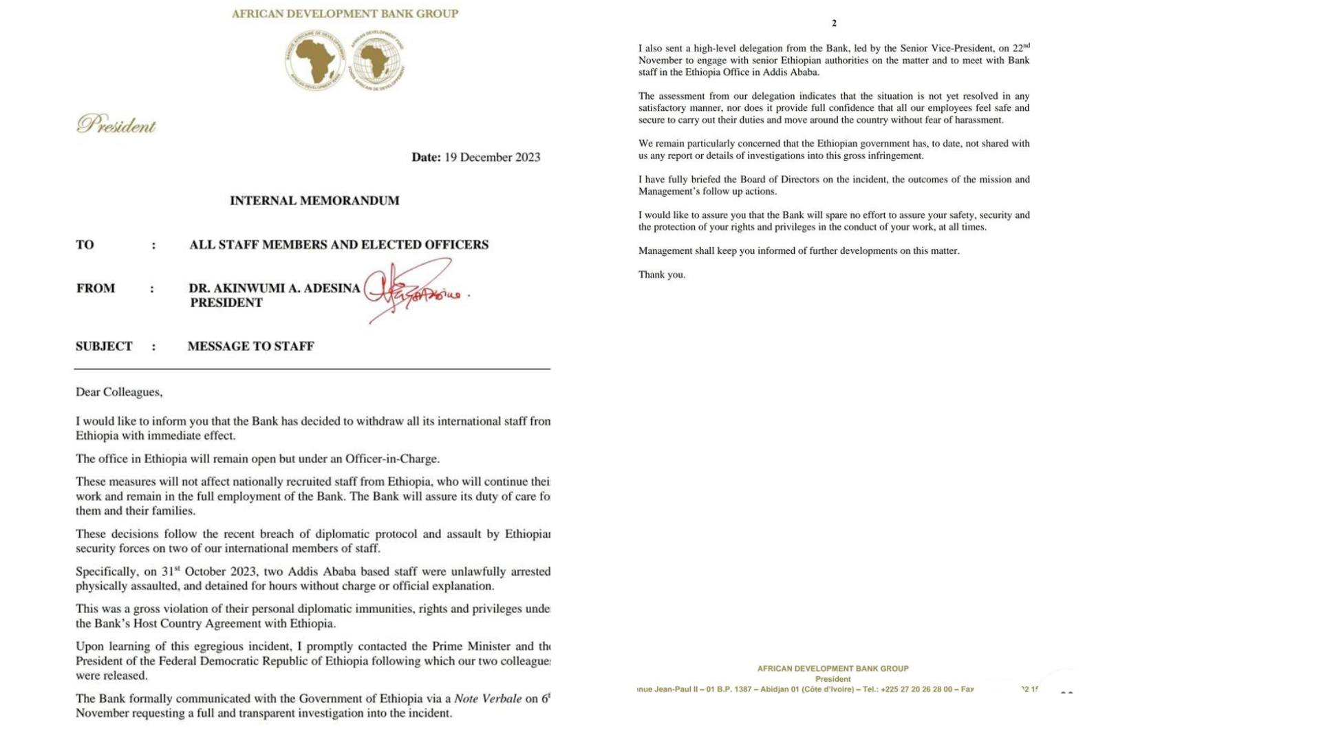 A high-level delegation, spearheaded by AfDB Vice President, visited Ethiopia and met with Ethiopian government officials on November 22, 2023. The vice president concluded that the matter remains unresolved, casting doubts on the safety and security of AfDB staff in Ethiopia. An internal letter dated December 19, 2023, expressed a lack of confidence in the current environment, making it challenging for AfDB staff to feel secure and move around without fear of harassment.