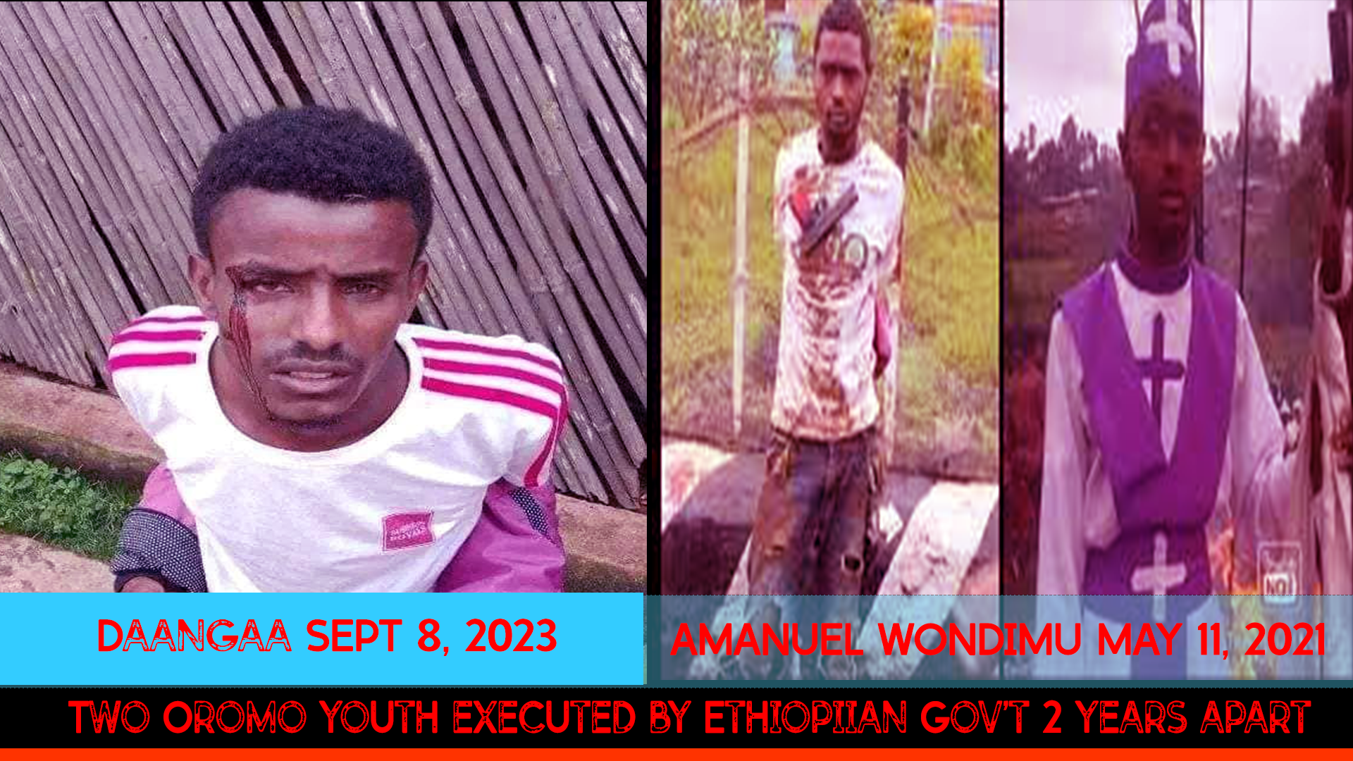 Ammas waggaa lama booda magaaluma Dambi Doollootti dargaggoo Daangaa jedhamu erga Abbaa Torbee jechuun ijoollee biroo waliin hidhanii booda ajjeesanii gatanii jiru. Ajjeechaa walfakkaataa Oromiyaa mara keessatti ittuma fufanii itti gaafatama tokko malee gaggeessaa jiru. Seerri waraqaa irra malee Itiyoophiyaa keessas Oromiyaa keessas hin jiru. Seerri isaanuma. Seerri isaan tajaajiluu malee isaan ittigaafatama seeraa jala hin jiran. Abbaa sodaatan ajjeesanii bakkeetti gataa jiru. Hedduu erga hidhanii booda mana hidhaatii baasanii ajjeesanii gataa jiru. Hojiin kun hojii yakkaa fi hojii diinummaa saba Oromoof qaban mullisa. Ajjeechaan kun hamma Walabummaan fi Bilisummaan Oromiyaa argamutti dhaabbachaa jiru. Qaamni warra yakka ajjeechaa kana seeratti dhiheessu tokkos hin jiru.
