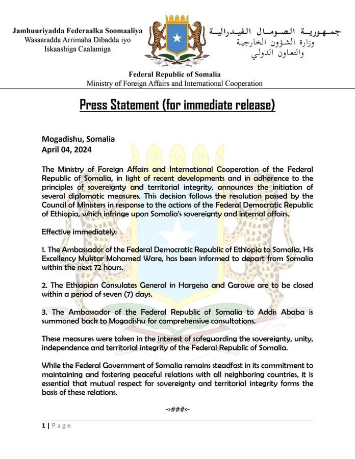 Recall of Somali Ambassador: The Ambassador of the Federal Republic of Somalia, servving in Finfinnee (Addis Ababa), has been recalled to Mogadishu for detailed consultations. This step aims to address the escalating tensions and seek a resolution through dialogue.